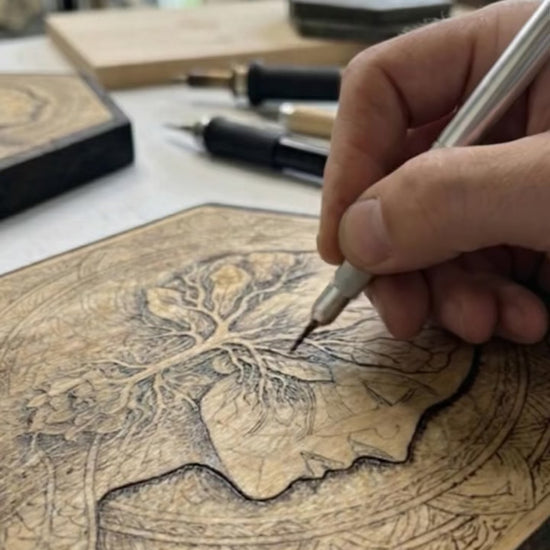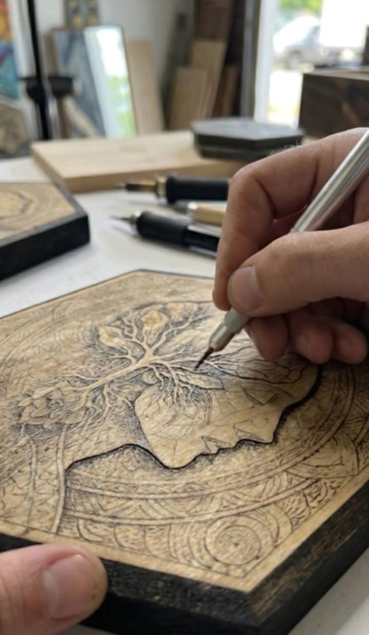 A personalized hexagon created through a collaborative process with Jeremy Morton Art. The piece begins with your story, symbol, lineage, or emotional signal. Jeremy develops an original concept sketch, burns the design into pine wood by hand, and paints layered pigments over the engraved surface, forming a surreal, anatomical work built around your meaning.