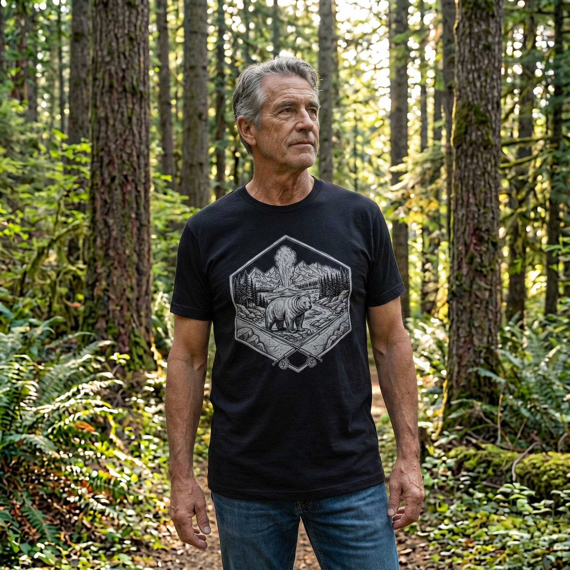 Still Bear is a Signal Threads™ field shirt featuring an original hand-drawn bear by Jeremy Morton, inspired by the quiet power of Yellowstone. Framed within a hexagon symbol of balance, the image reflects stillness, strength, and attention — qualities shaped by land where movement slows and awareness deepens. Designed for everyday wear, the piece carries a calm, grounded presence that feels both timeless and personal within the Somatic Signal™ system.